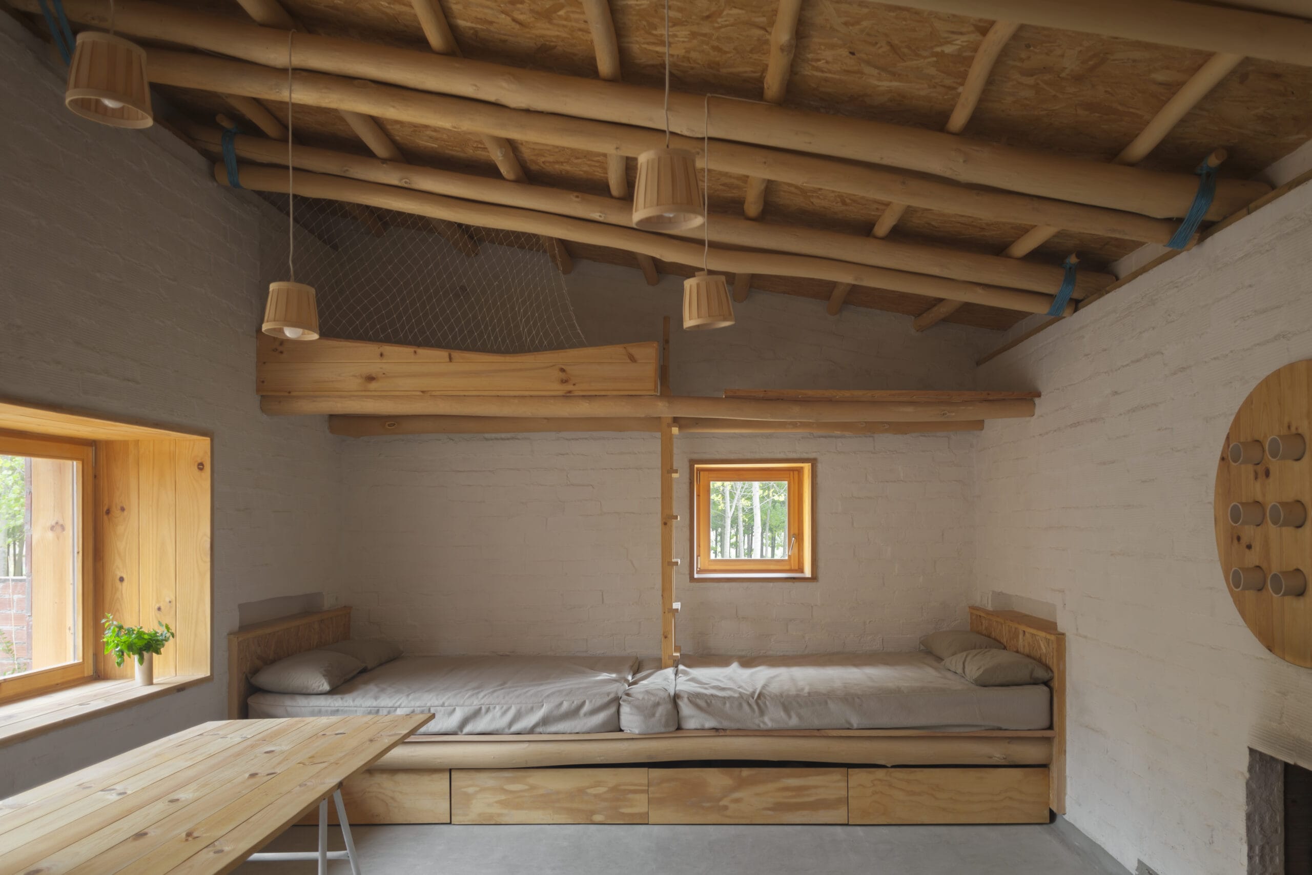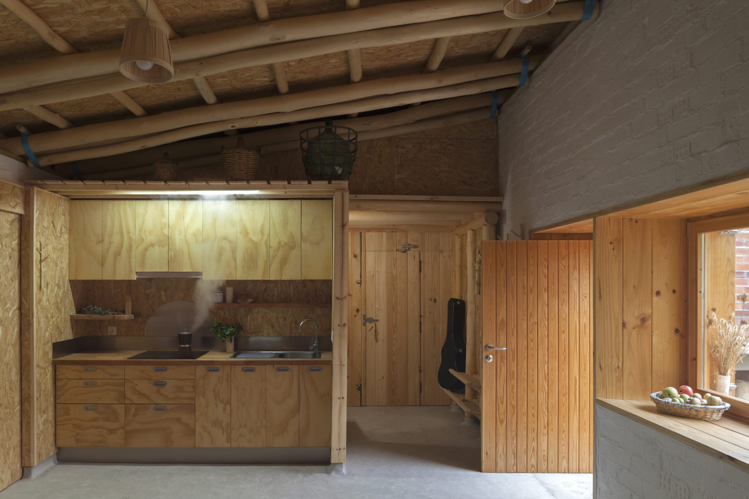21 Chopos recién talados, pelados justo a continuación de la tala y blanqueados con lejía y estropajo metálico: vigas, dinteles, correas y pilares de madera resueltos; pacas de mezcla de trigo y centeno de los campos de cultivo circundantes: aislamiento resuelto; ladrillos, tableros de madera OSB y hormigón disponibles en un radio de 50 km: cerramientos y solados resueltos. La obra pretende ser un ejercicio de racionalidad económica y constructiva. Construir con los materiales del entorno inmediato es una lección a menudo olvidada por la arquitectura contemporánea y aprendida a través de la arquitectura popular, que habla desde hace mucho tiempo de economía, de ecología y de sostenibilidad, conceptos que han dejado de ser una moda para convertirse en necesidad.