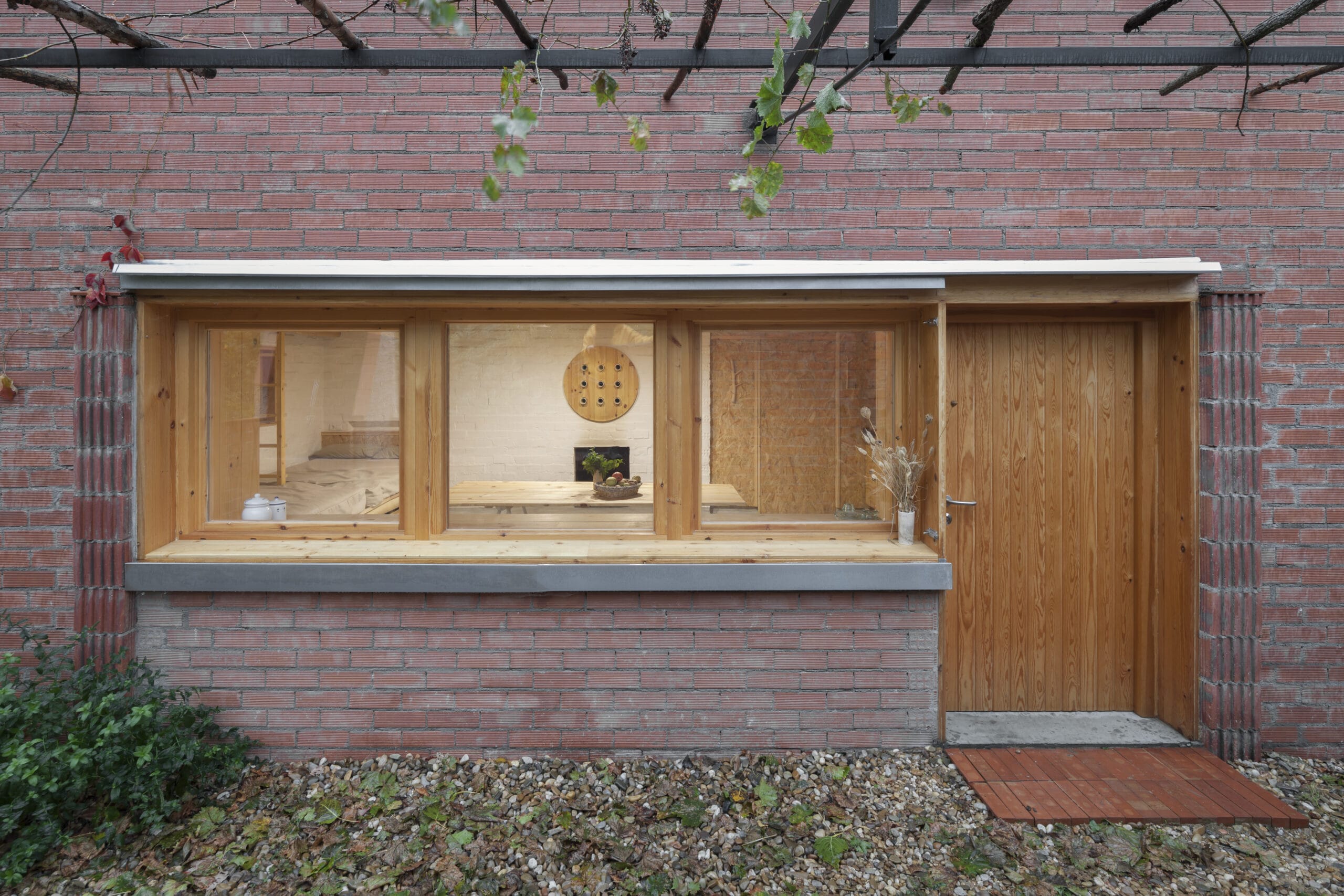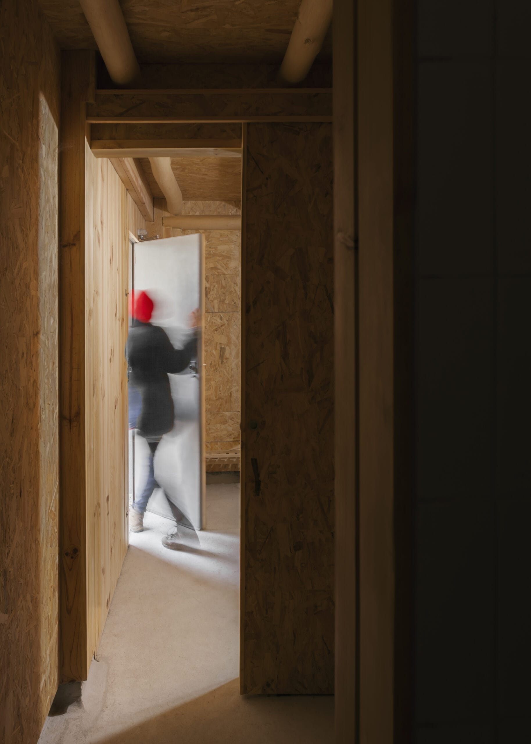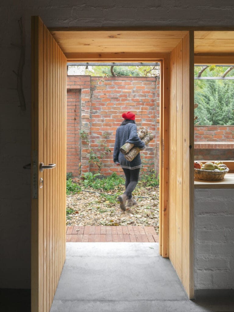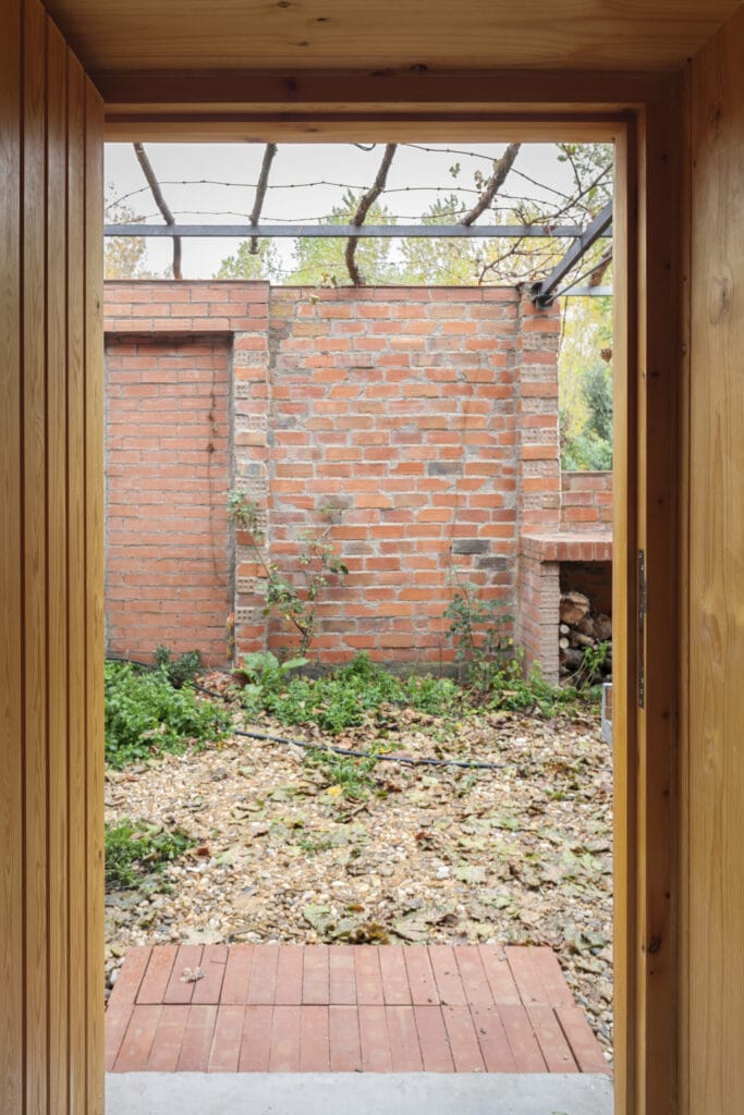 A partir del volumen principal preexistente, construido con cerramientos de ladrillo hueco doble, se plantea la apertura de los mínimos huecos necesarios para un espacio confortable. Se mantiene el hueco preexistente en la zona de camas. Se abre uno nuevo hacia el patio que soluciona las necesidades de iluminación, ventilación y conexión interior-exterior que, debido a sus dimensiones, se refuerza con jambas de termoarcilla y un dintel a base de rollizos de chopo. Los huecos se resuelven con carpinterías de madera de pino y, en el caso de ser estas de vidrio, cuentan con contraventanas exteriores opacas de tablero contrachapado de madera, rematadas en chapa de acero que permite cerrar el volumen al exterior por completo. El resultado es un volumen fundamentalmente opaco al exterior por razones de confort térmico, intimidad y seguridad. Un cofre.