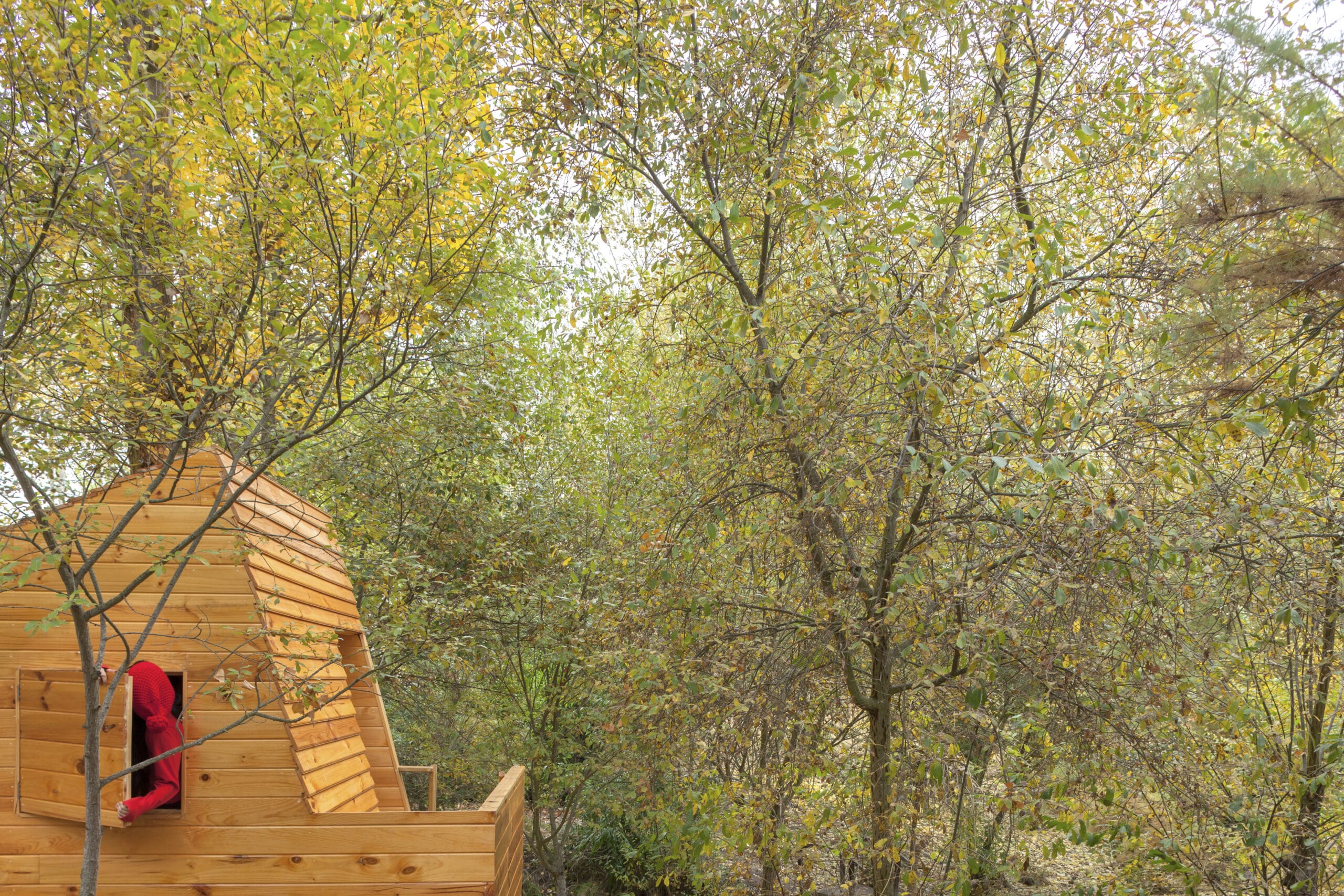 Refugio integrado en el paisaje, al fondo se observa una chopera en otoño.